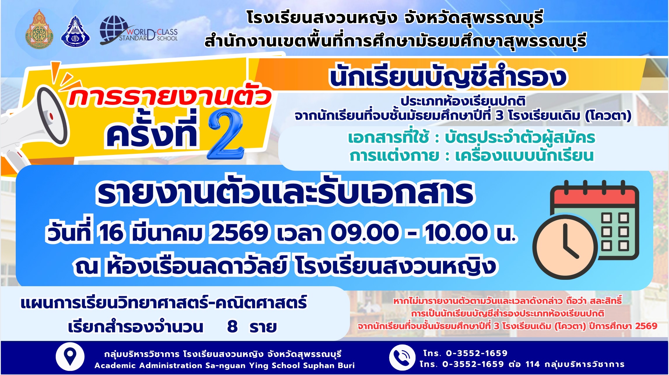 รายงานตัวนักเรียนบัญชีสำรอง ประเภทโควตา ปีการศึกษา 2569