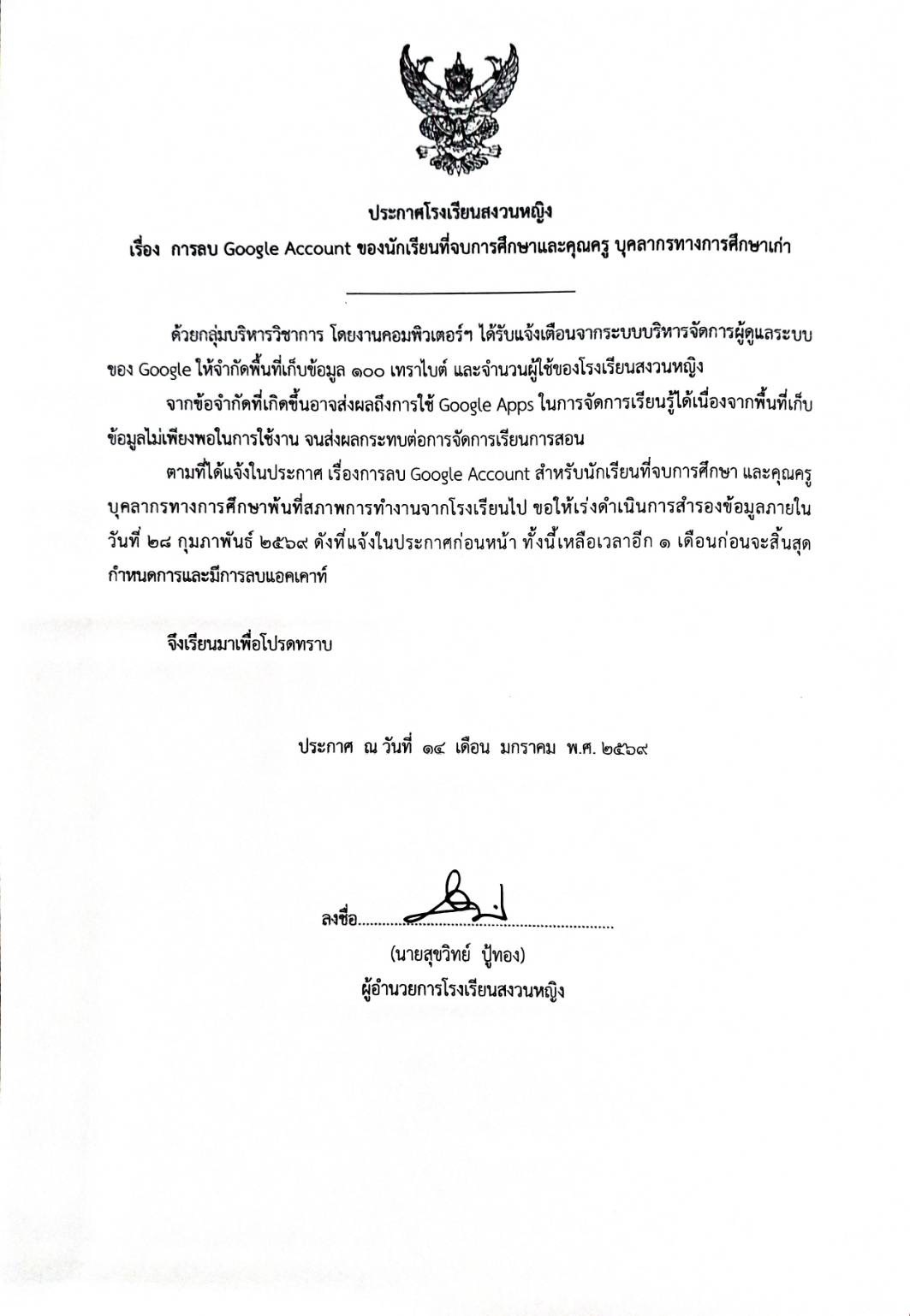 ประกาศเรื่องการลบ Google Account ของนักเรียนที่จบการศึกษา คุณครูและบุคลากรที่พ้นสภาพการทำงาน